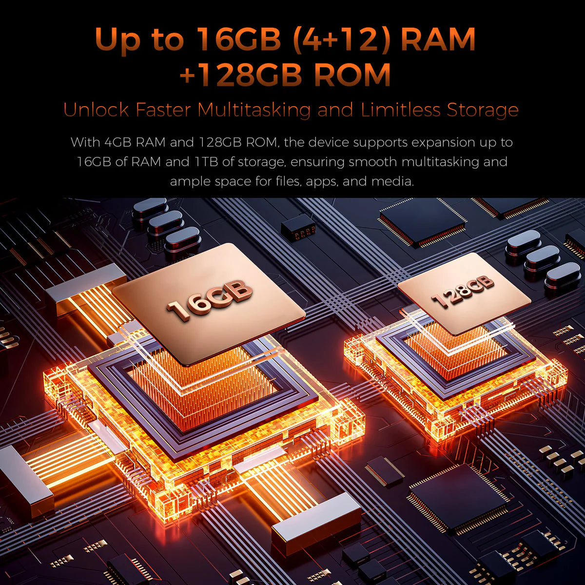 Avec 16 Go de RAM (dont RAM virtuelle) et 128 Go de stockage interne, vous disposez de suffisamment d’espace pour vos applications, documents, photos et vidéos sans avoir à faire du tri en permanence. Et si ce n’est pas suffisant, le stockage peut être étendu via carte microSD.