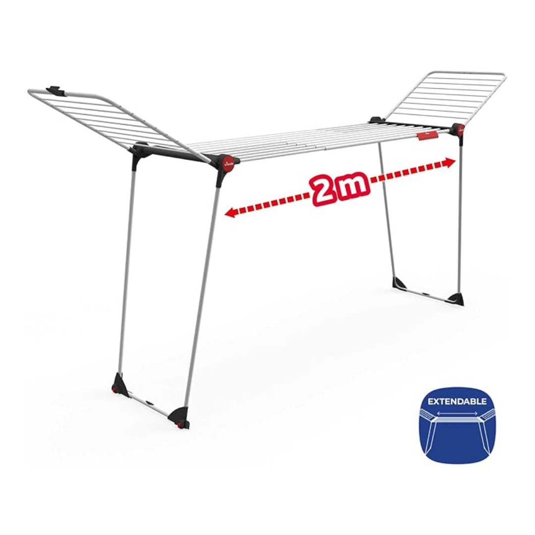 Grâce à sa structure ajustable de 117 à 205 cm, le séchoir Vileda Infinity peut s’adapter à tous les besoins de séchage, des petits vêtements jusqu’aux draps et pantalons longs.